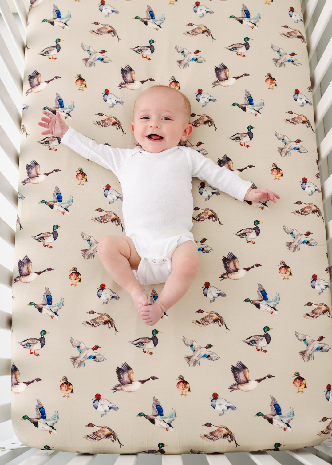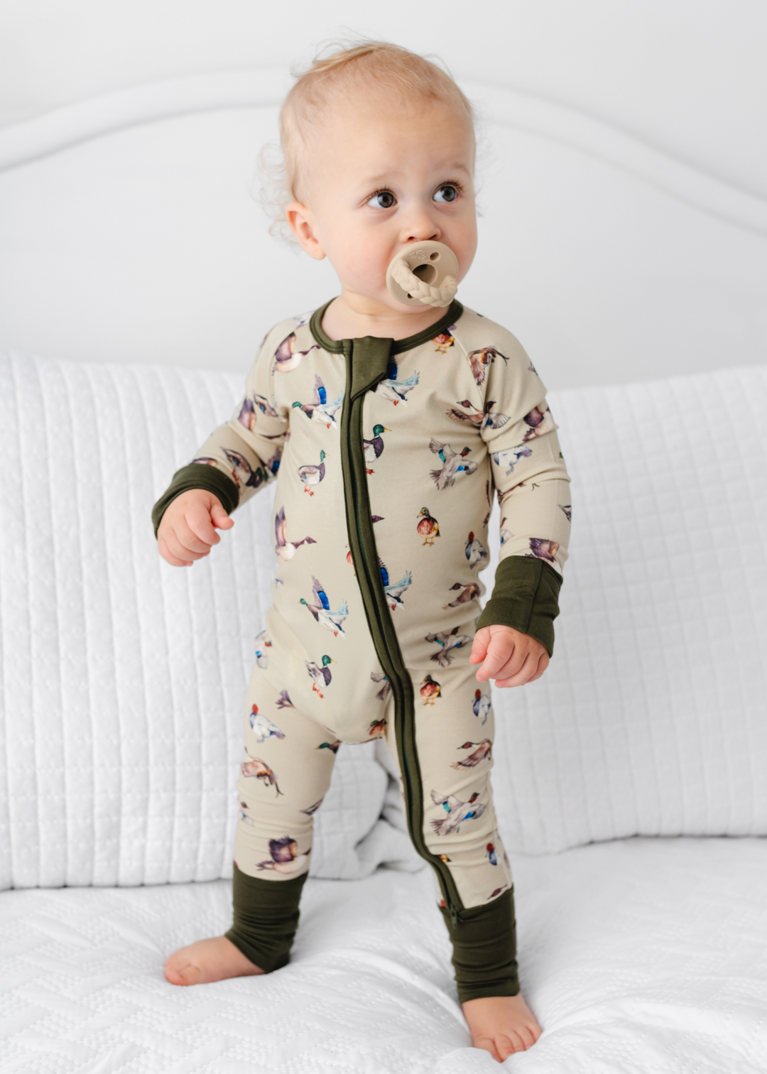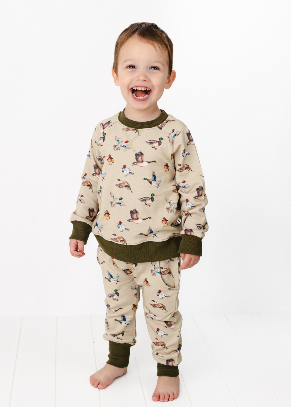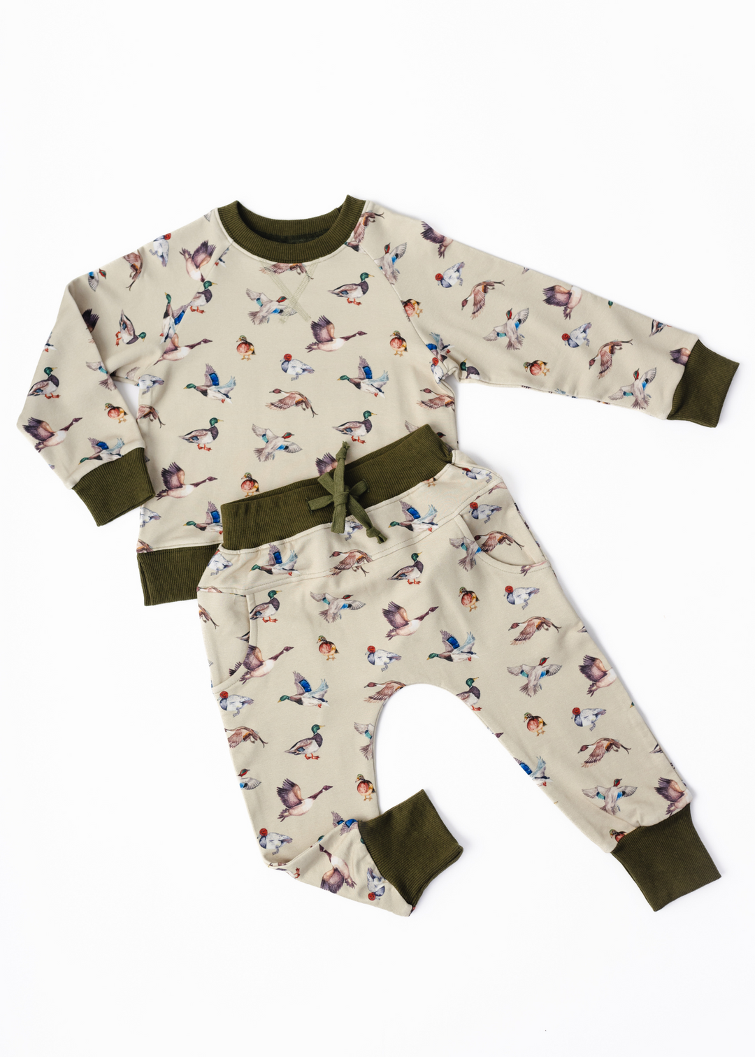 We have long wanted a duck print, being proud midwesterners. This woodsy collection is a more realistic watercolor style with a neutral tan background and with olive green cuffs. When dreaming up names for this print, we thought, let's add in a watercolor GOOSE...and voila: Duck Duck Goose was born! 🦆