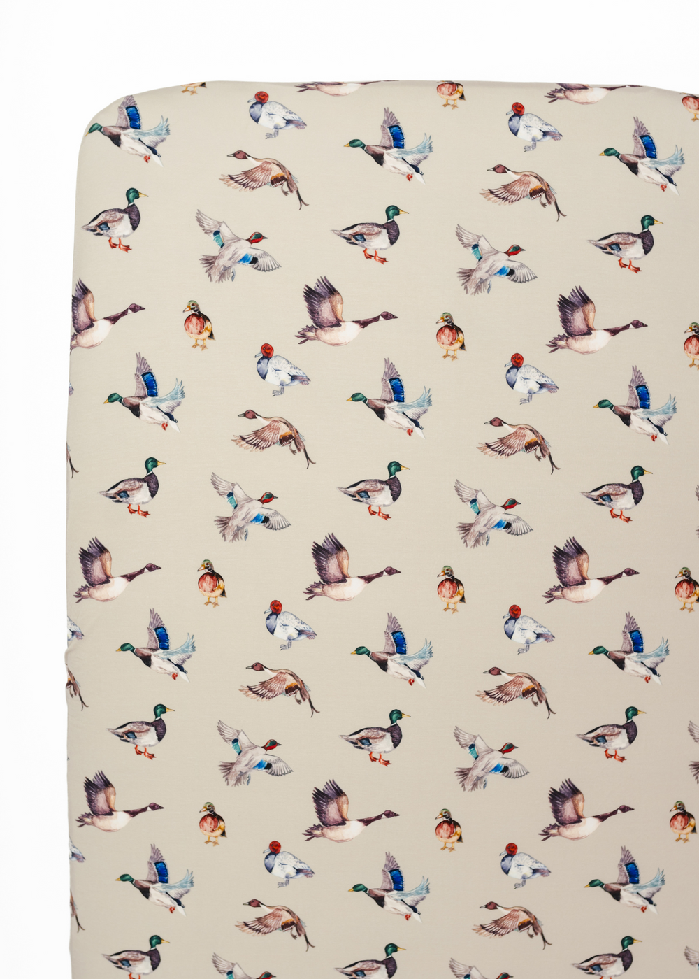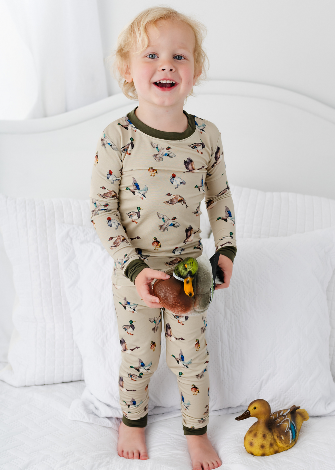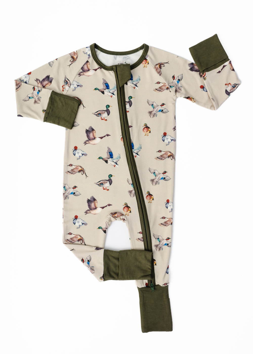 We have long wanted a duck print, being proud midwesterners. This woodsy collection is a more realistic watercolor style with a neutral tan background and with olive green cuffs. When dreaming up names for this print, we thought, let's add in a watercolor GOOSE...and voila: Duck Duck Goose was born! 🦆