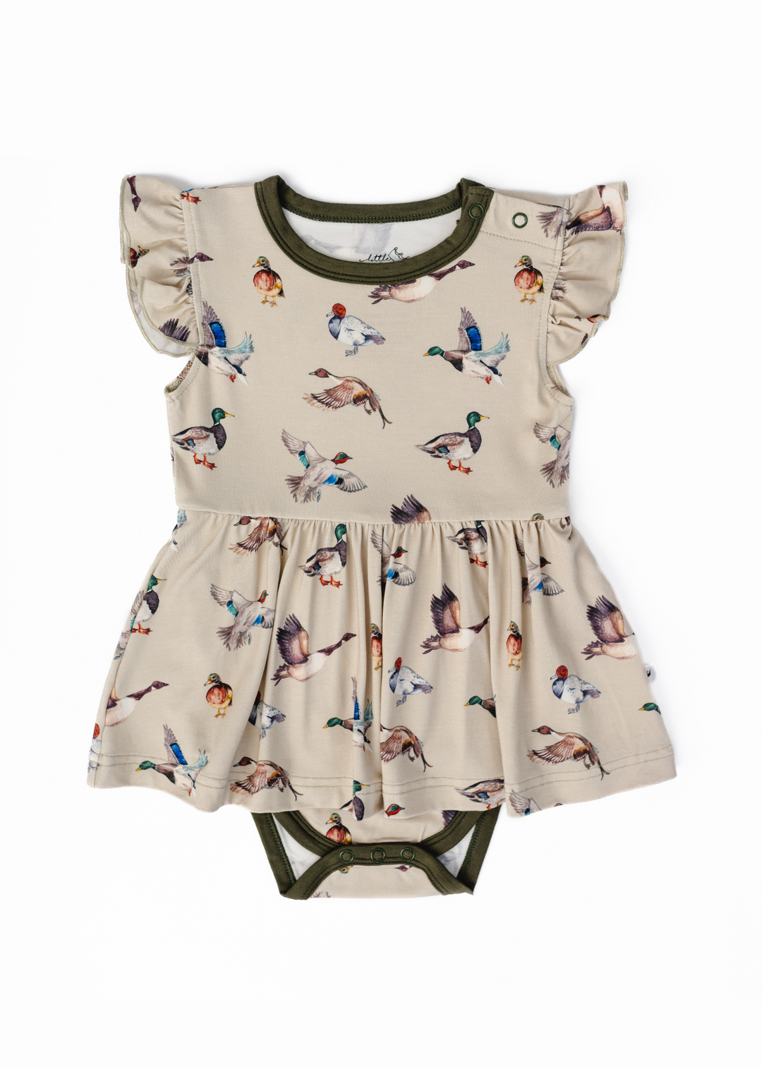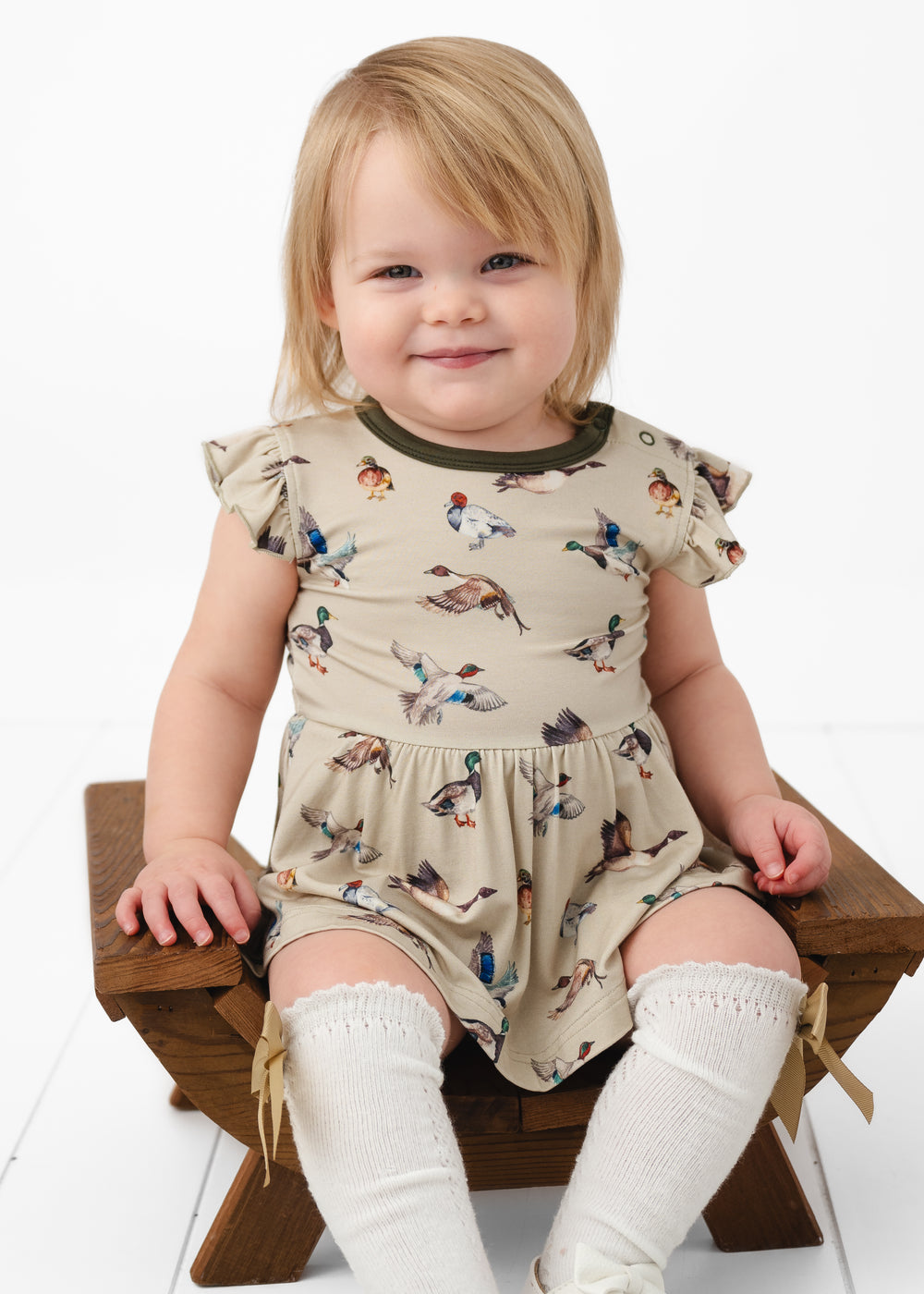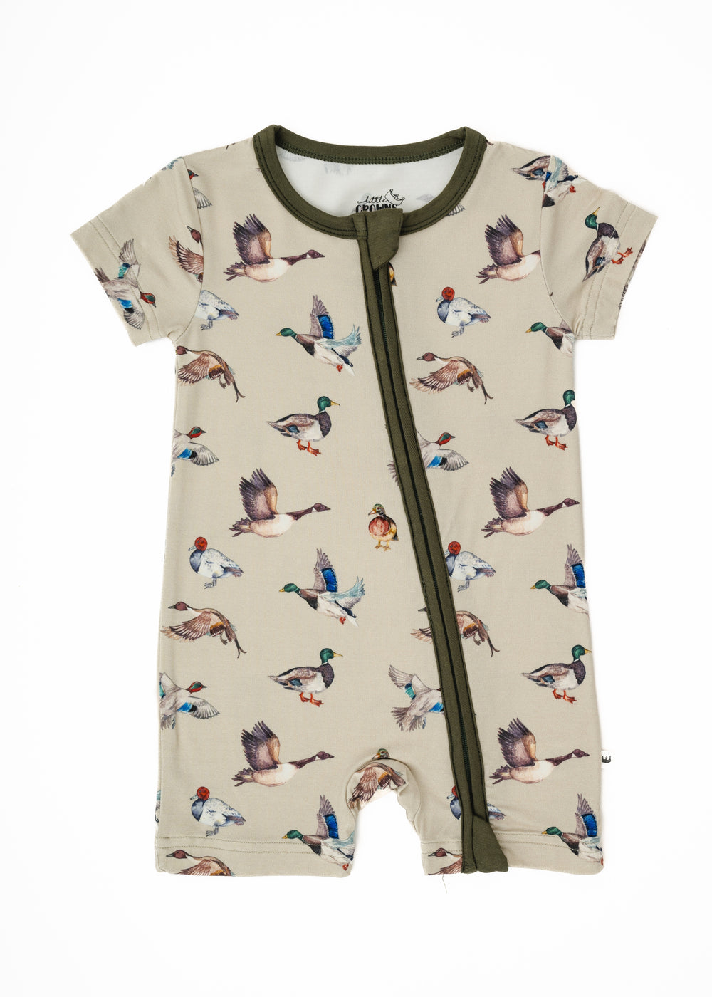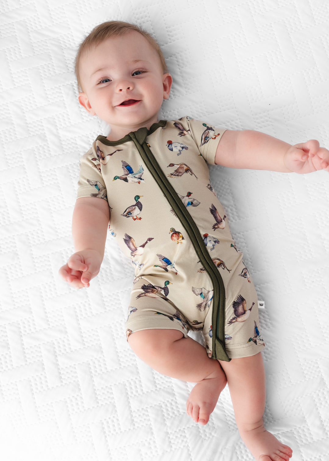 We have long wanted a duck print, being proud midwesterners. This woodsy collection is a more realistic watercolor style with a neutral tan background and with olive green cuffs. When dreaming up names for this print, we thought, let's add in a watercolor GOOSE...and voila: Duck Duck Goose was born! 🦆
