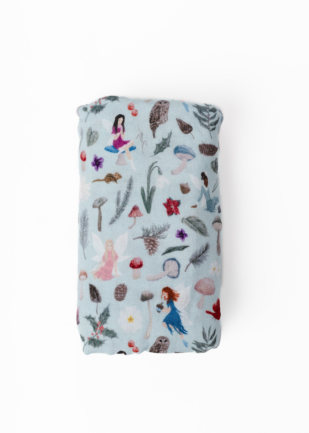 Frosted Fairies is reminiscent of it’s sister print: Blends of foliage, winter flowers, adorable critters, & mushrooms are scattered about with hidden Fairies throughout. The original fairies from the OG design are back, but this time they are wearing their winter wardrobe.