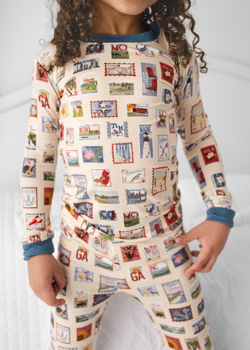 Introducing our Postage Stamp Collection, our unique 4th of July bamboo print! Get ready for some Americana vibes! You can find many beautiful, natural wonders in America scattered throughout this vintage red white and blue print featuring postage stamps from all 50 US States!