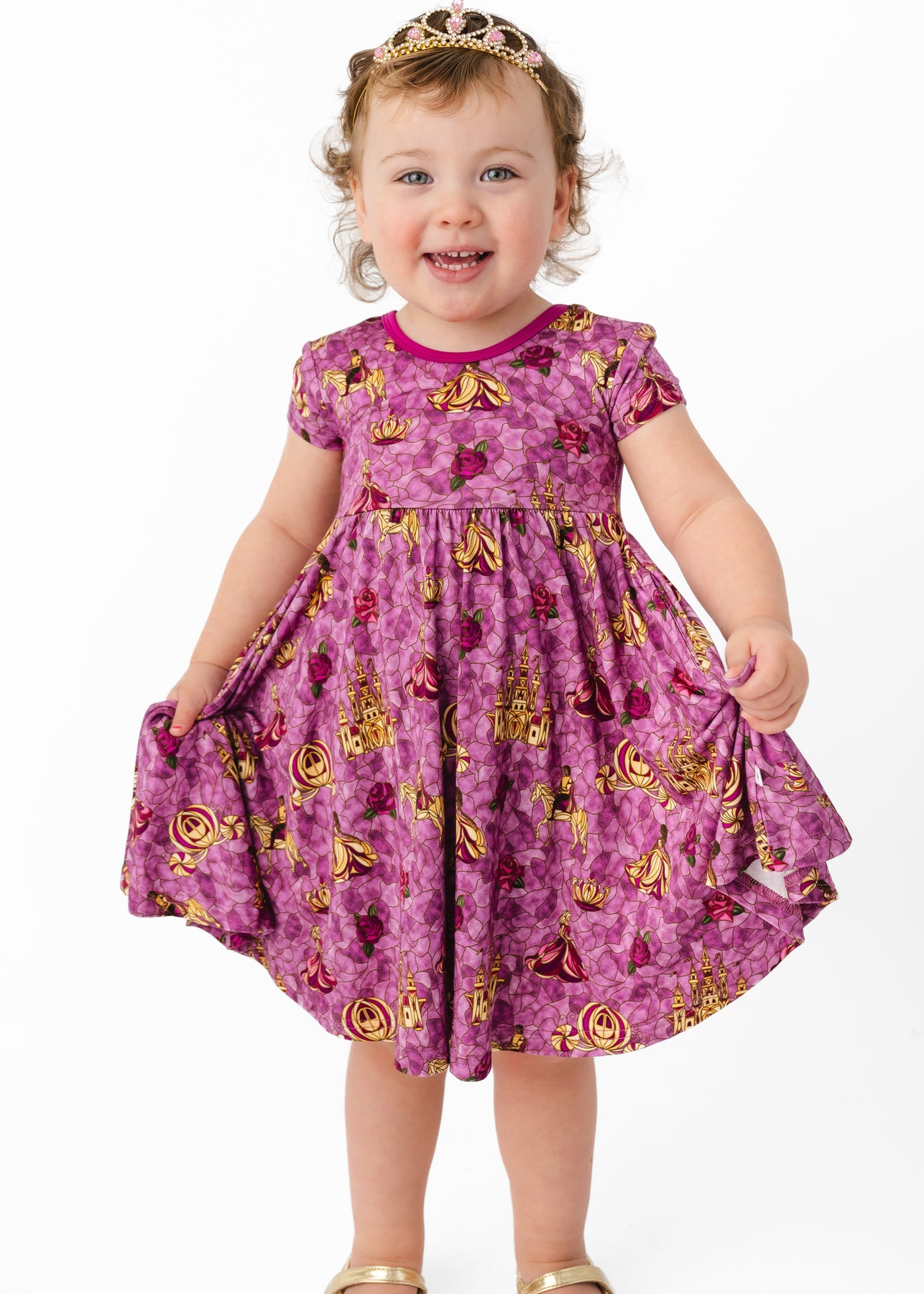Introducing one of our most unique and dazzling designs we’ve ever made! Our stunning purply-pink glass pattern features pops of yellows with princesses, a prince and his trusty steed, roses, a crown, a castle and a carriage.
