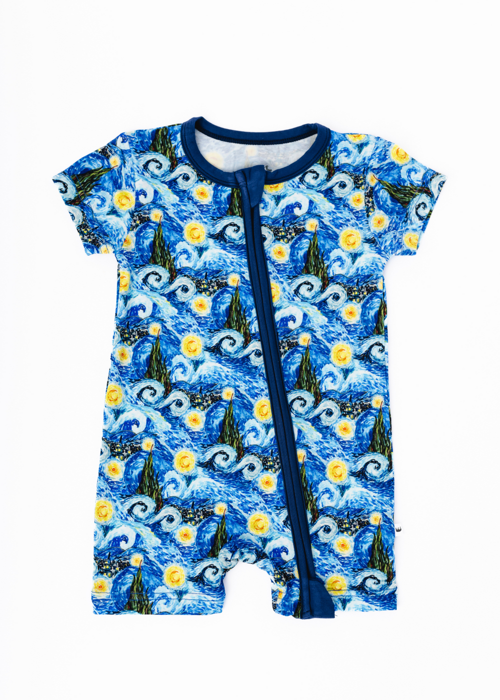Kick up the cuteness in your little one's wardrobe with our Starry Night Shortie! This super soft zippered romper is the perfect pick for adorable daywear - featuring buttery soft bamboo fabric and double zippers for convenience. Get ready for spring and summer playtime - this one's a must have!