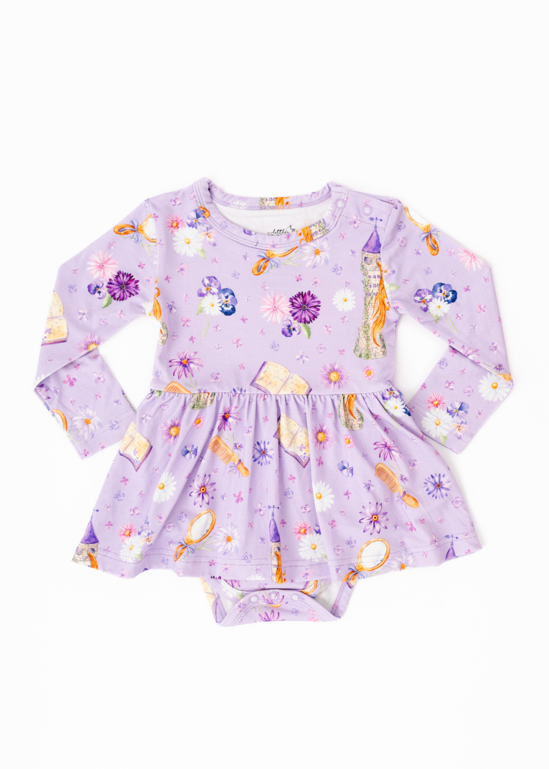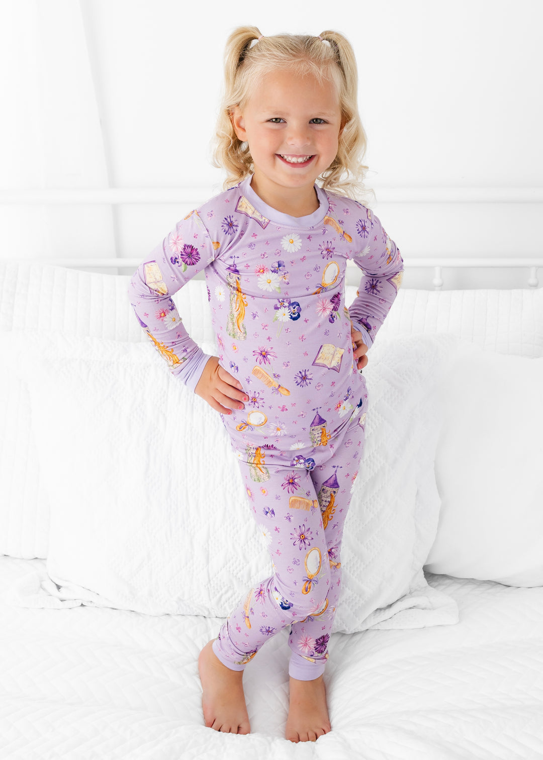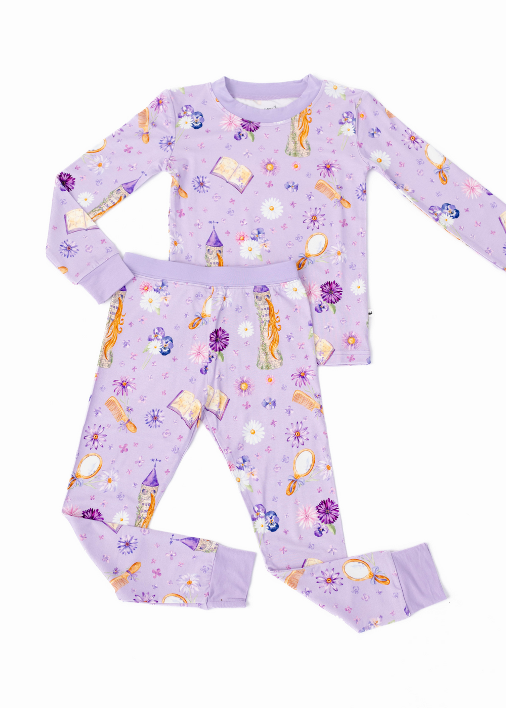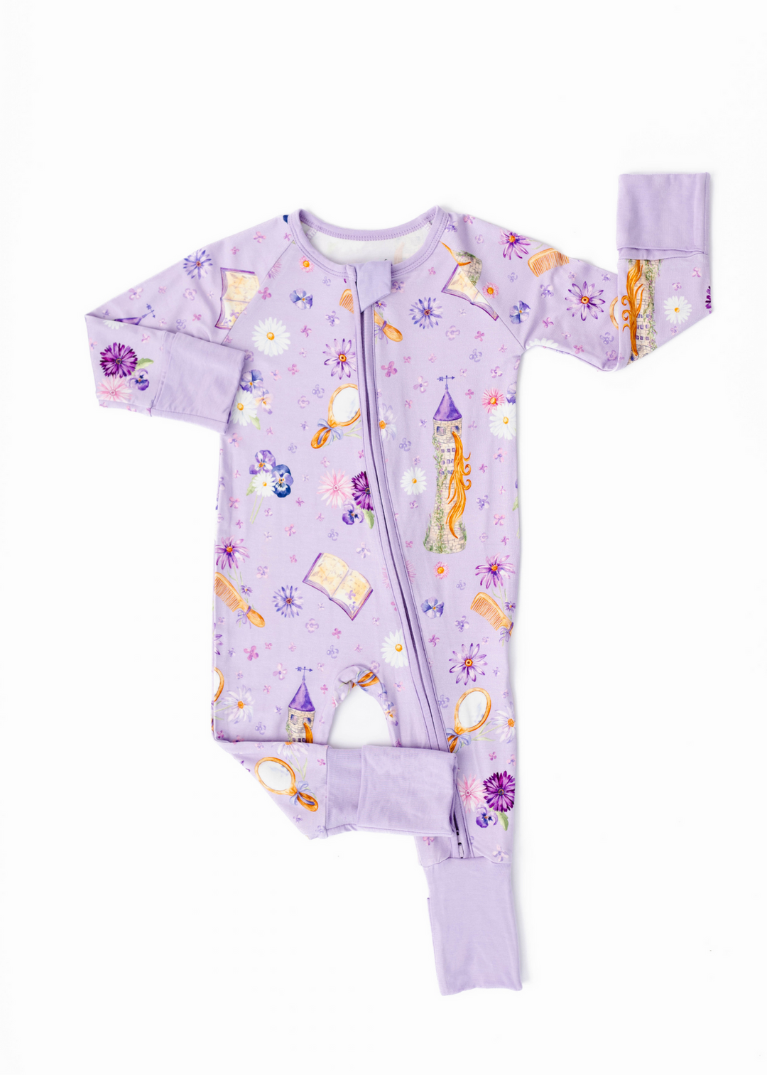 Our enchanting Rapunzel collection is the perfect addition to your little one's closet! This water color design has whimsical flowers, magical books and other enchanting items all throughout. Choose from your favorite products in this collection including bamboo baby sleepers, two piece jammies, shortie rompers, baby and toddler dresses, sleep sacks, and more! This gorgeous collection is made from our signature buttery soft bamboo fabric that's perfect for sensitive skin and so cooling. Create the perfect newborn outfit, nursery, or baby shower gift with our Rapunzel Collection!