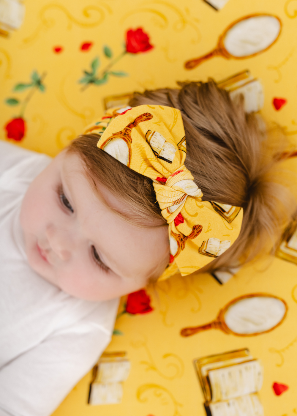 Introducing our Beauty design, a gorgeous new print added to our whimsical Fairy Tale Collection. This beautiful children's story is a favorite around the world! Our design features books, mirrors, with roses and petals on a stunning gold backdrop accompanied by deep gold embellishments.