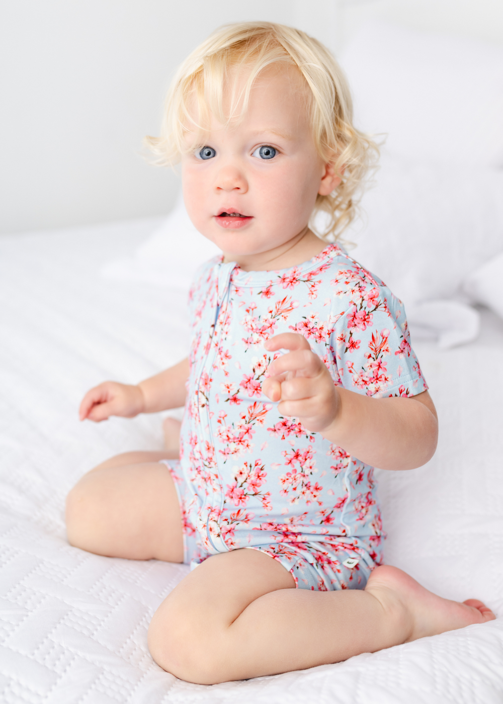 Kick up the cuteness in your little one's wardrobe with our Cherry Blossom Shortie Romper! This super soft zippered romper is the perfect pick for adorable daywear - featuring buttery soft bamboo fabric and double zippers for convenience. Get ready for spring and summer playtime - this one's a must have!