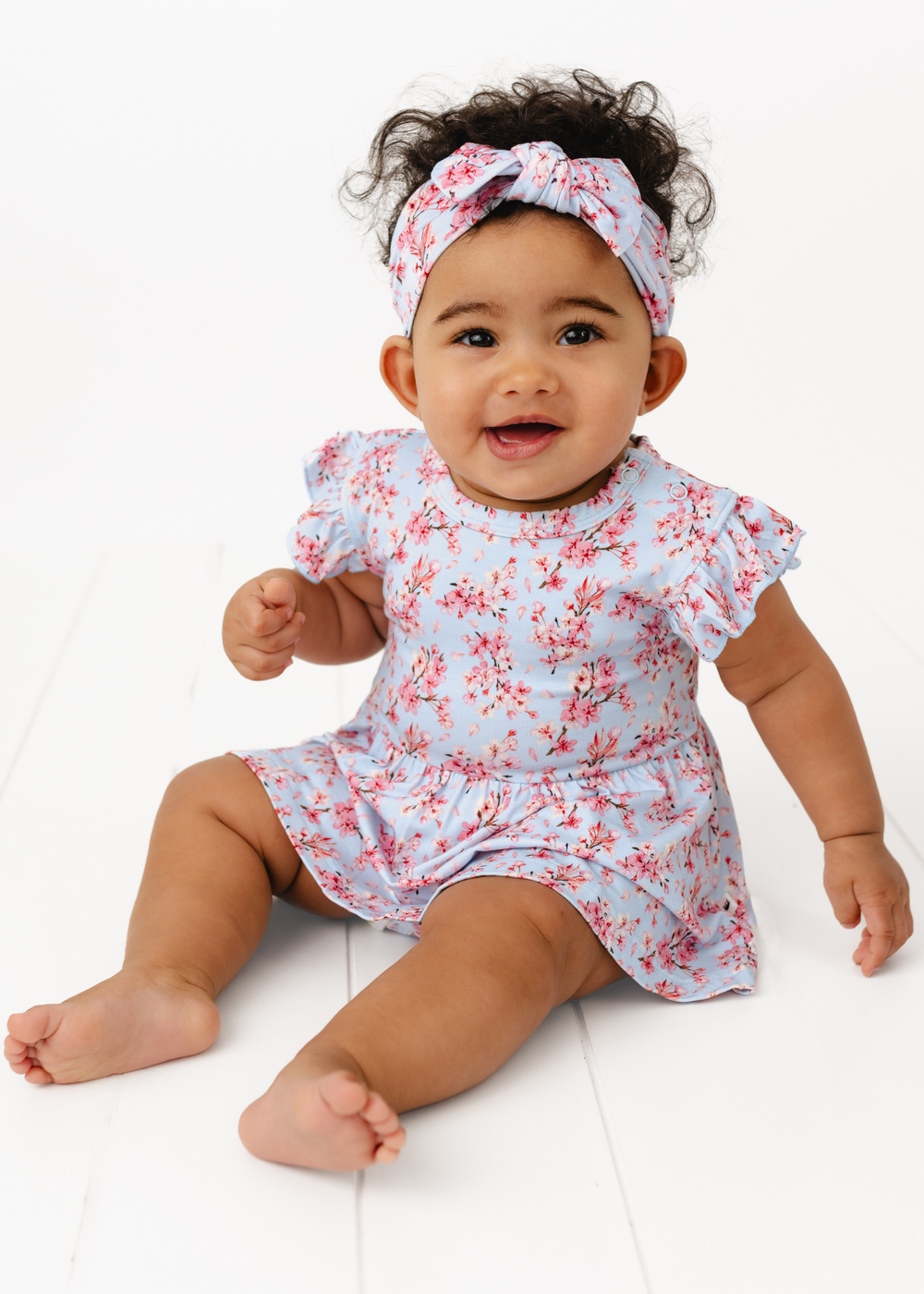 Say hello to our new watercolor floral, Cherry Blossom Baby Dress! Crafted from buttery soft bamboo, this darling dress has two snaps at the shoulder and three at the crotch for easy diaper changes. The flutter sleeves provide a cute, feminine touch!