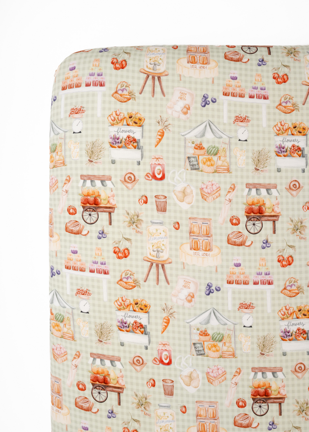 This beautiful Farmer's Market crib sheet is super soft, sensitive skin-friendly, and amazingly stretchy!