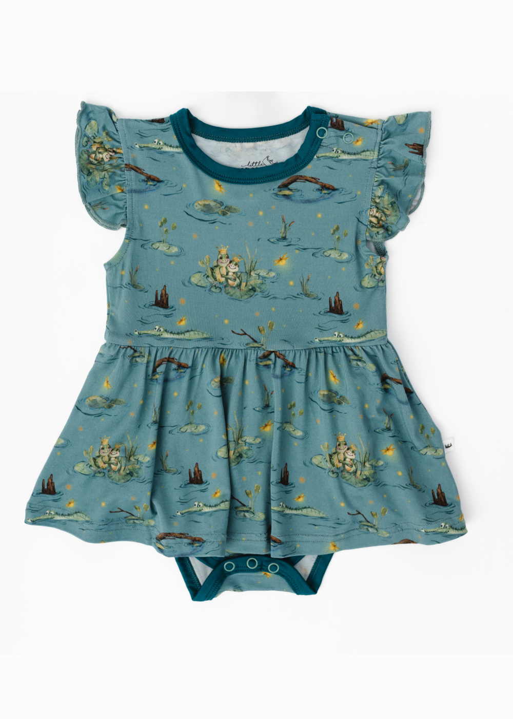 This beautifully bright teal design is covered in watercolor illustrations of frogs, alligators, & lightning bugs. This print is inspired by the classic fairytale of Frog Prince & is perfect for fans of The Princess & the Frog!