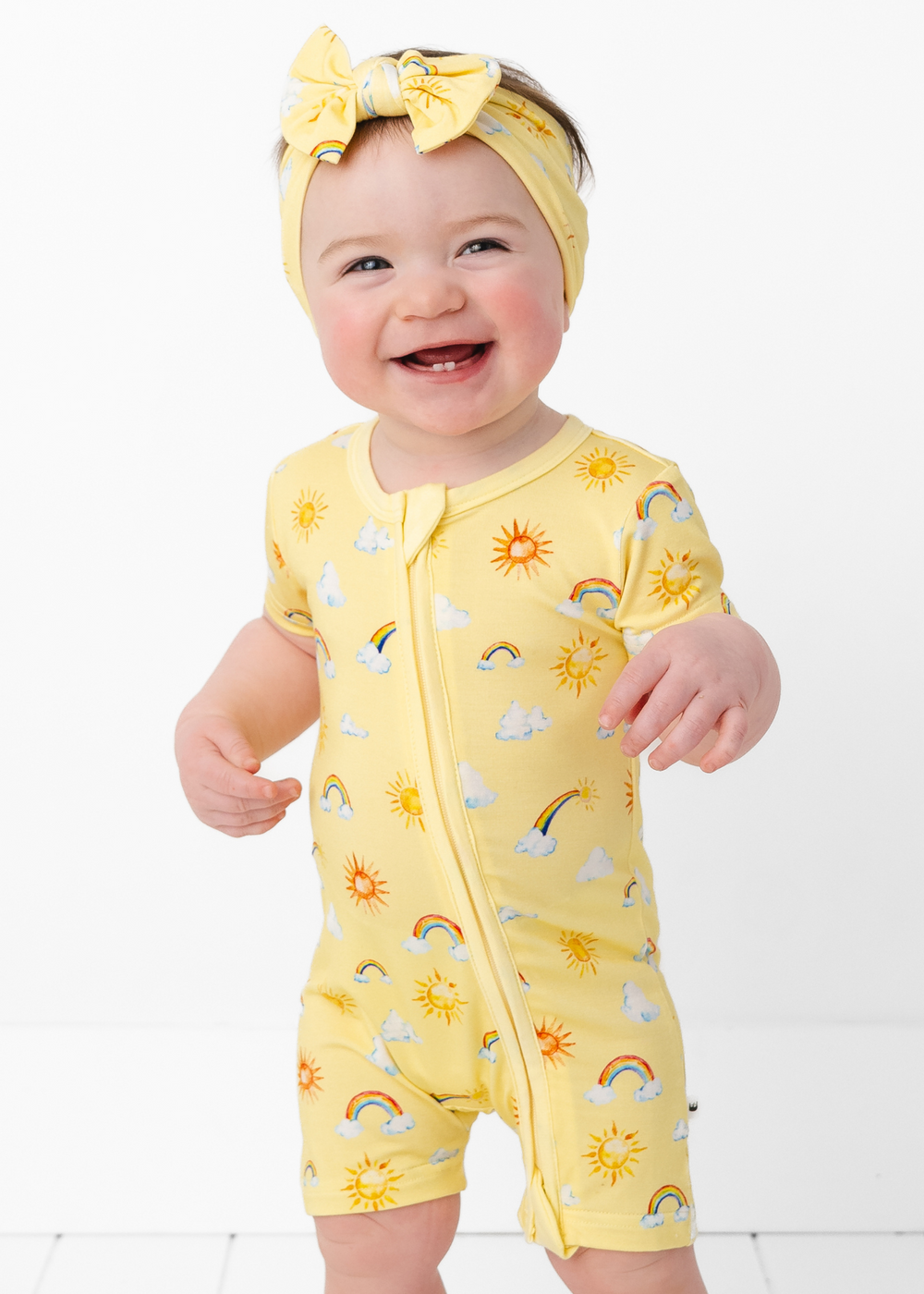 Kick up the cuteness in your little one's wardrobe with our Sunshine & Rainbows Shortie Romper! This super soft zippered romper is the perfect pick for adorable daywear - featuring buttery soft bamboo fabric and double zippers for convenience. Get ready for spring and summer playtime - this one's a must have!