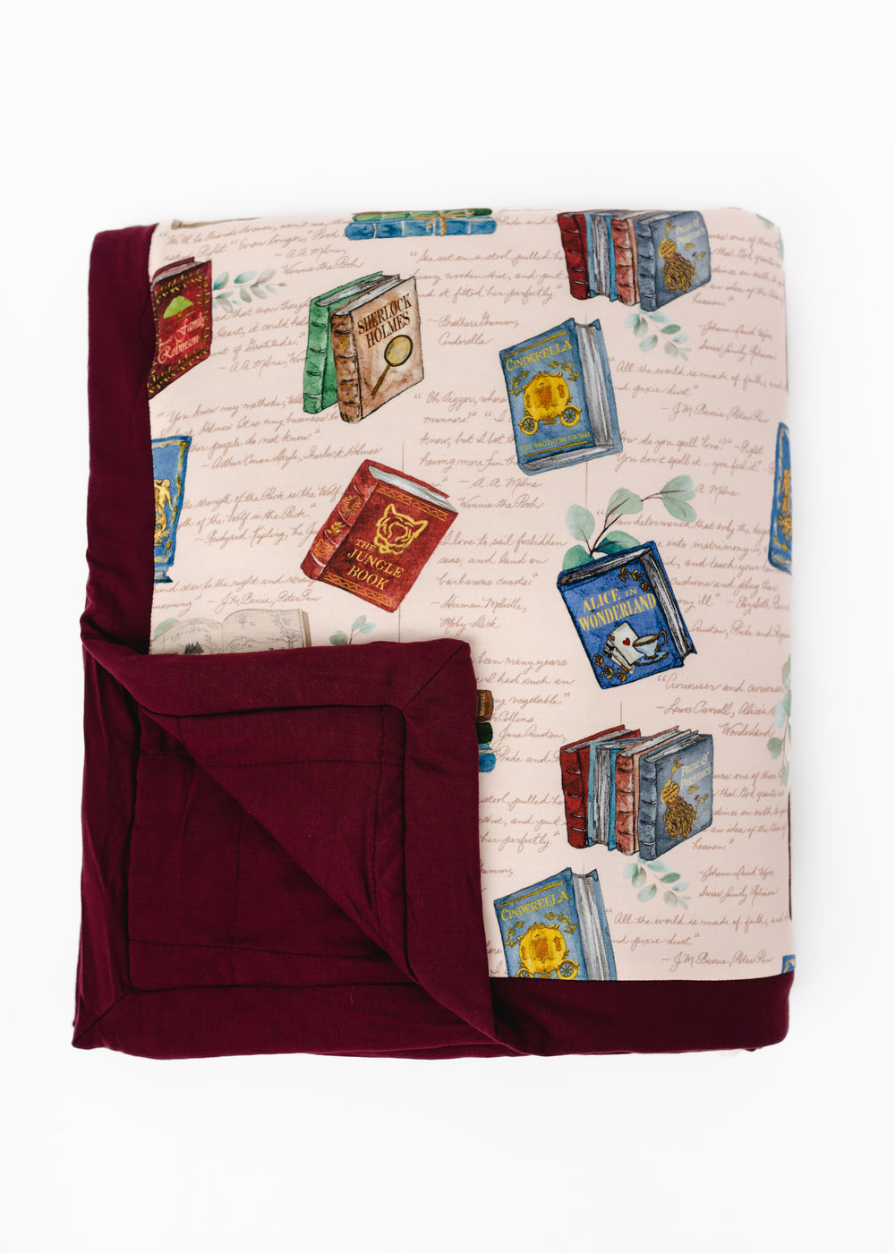Our Classic Books buttery soft blanket is oversized at 49x69 inches and made from our luxuriously soft bamboo fabric that you all have come to know and love. Stuffed with 100% polyester to add a fluffy filling, this blanket is thick and luscious while also having that cool-to-the-touch feel that the outer bamboo layers provides.