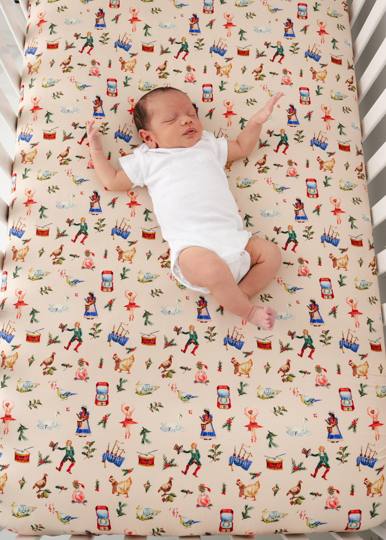 Sleep soundly with our 12 Days of Christmas Crib Sheet! This beautiful crib sheet is crafted from 95% bamboo 5% spandex. Super soft, sensitive skin-friendly, and amazingly stretchy, it’s a no-brainer for sweet (dreams) slumber!