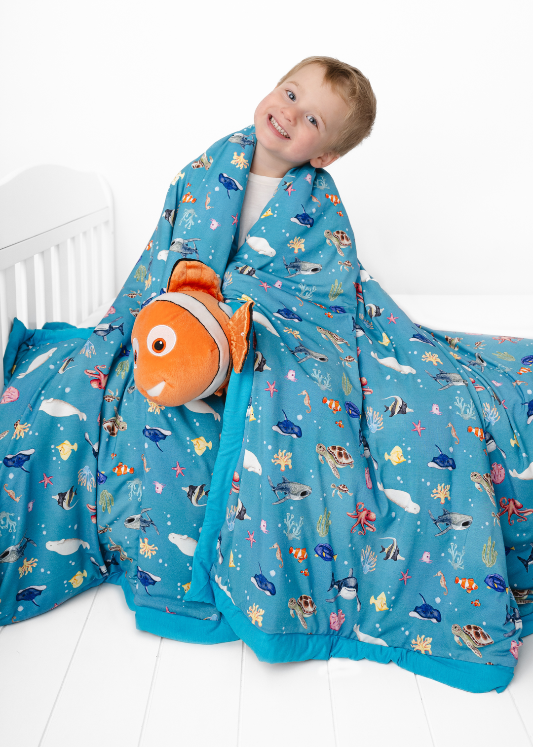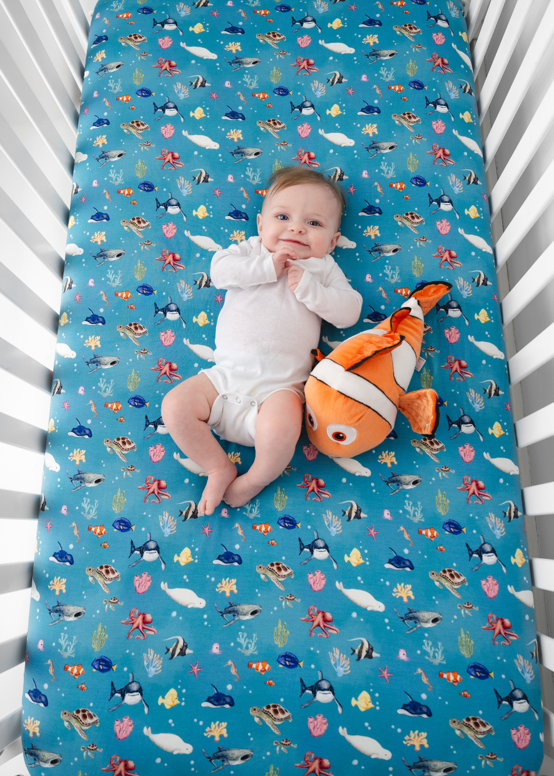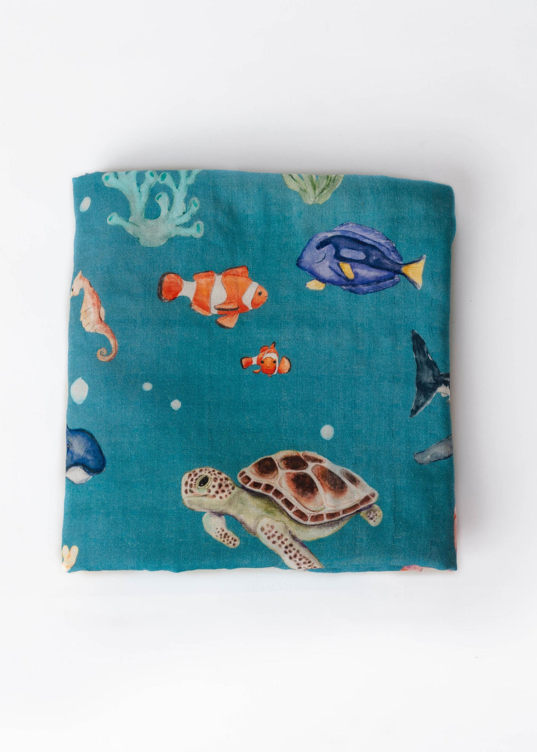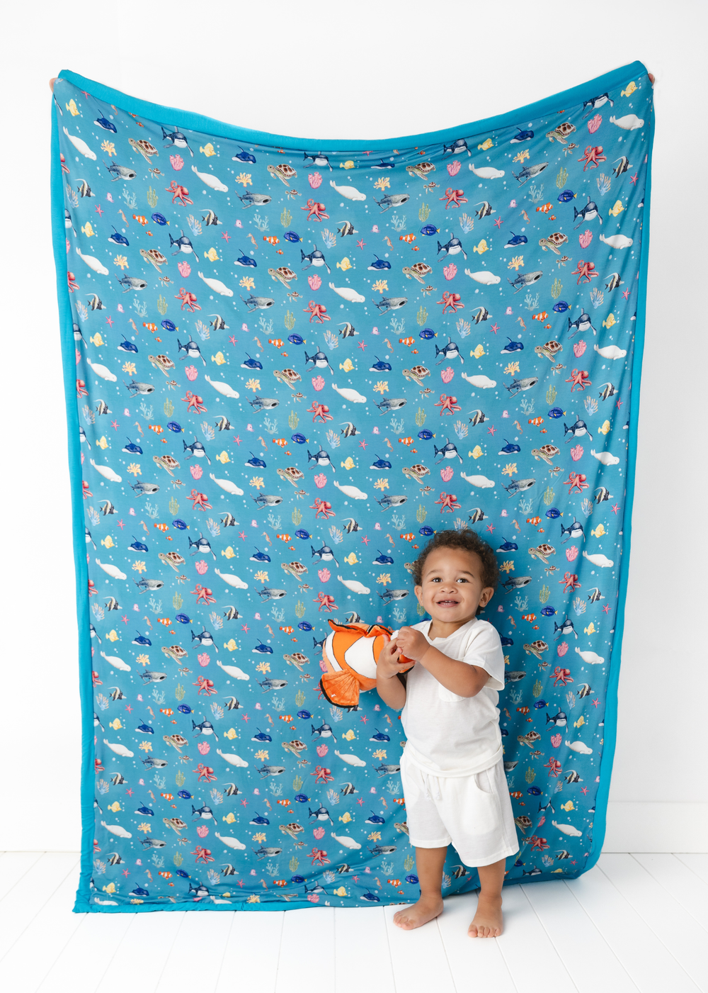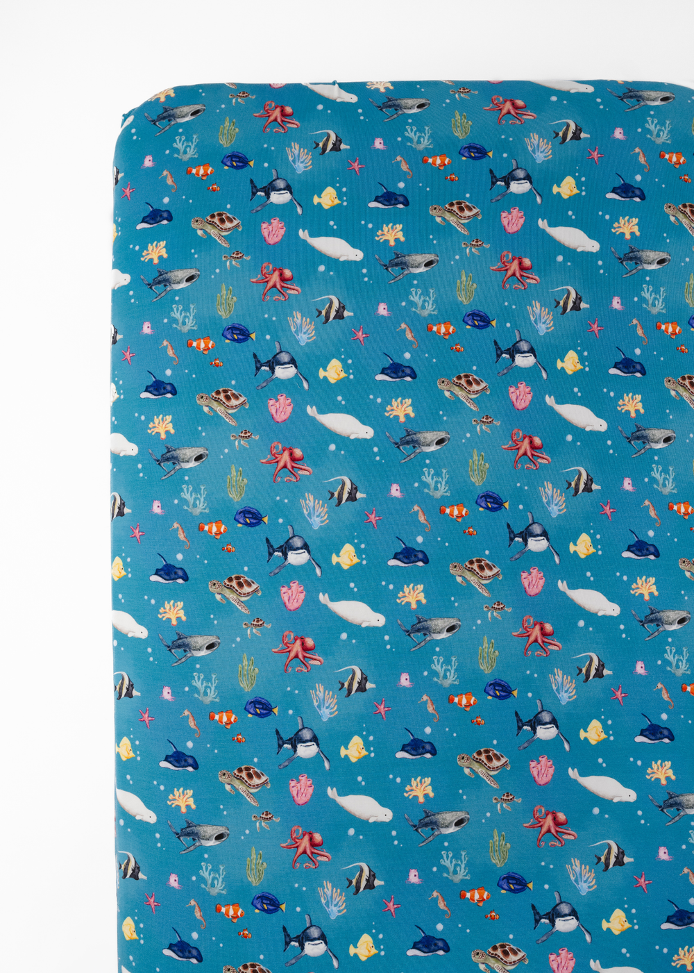 'Fish are Friends' collection is a fan favorite back from the vault! This gorgeous and vivid print features watercolor style drawings of all the familiar species of fish & friends you know and love: clownfish, regal blue tang, moorish idol, yellow tang, spotted eagle ray, octopus, sea horse, star fish, sea turtles, whale shark, beluga whales, and great white sharks!