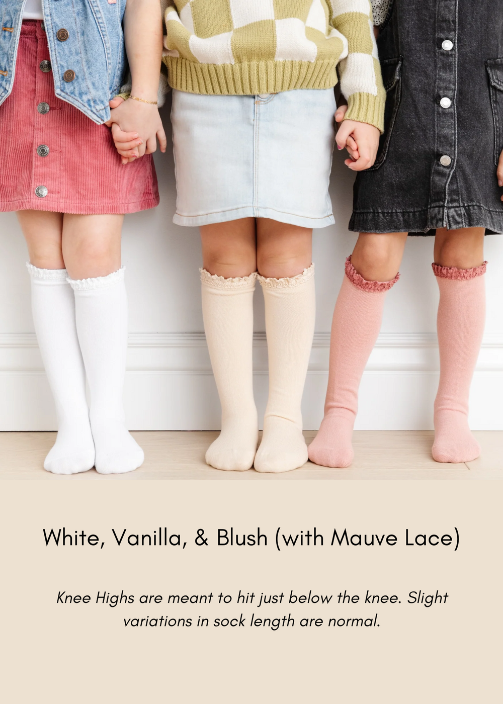 Contains 3 pairs of adorable lace trimmed knee-high socks in the following colors: White, Vanilla & Blush (with Mauve Lace)