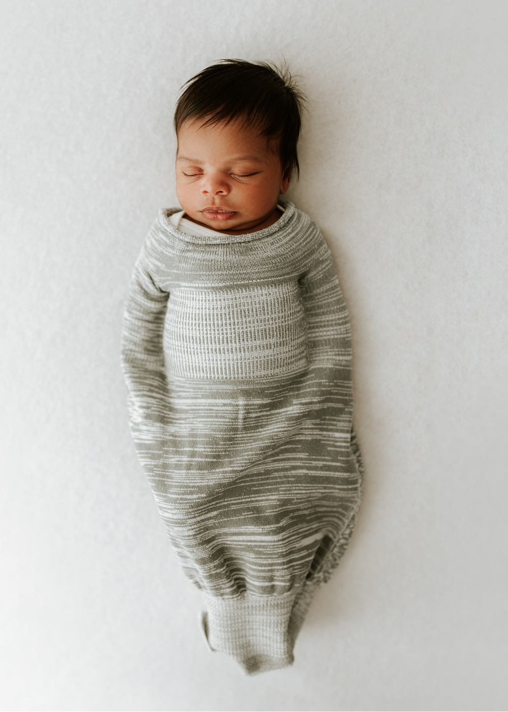 This Swaddelini is made from post-consumer recycled Nylon also paired with a moisture wicking and antimicrobial Nylon. The compression comes from the elastic yarn covered with nylon. All made in North Carolina, USA.