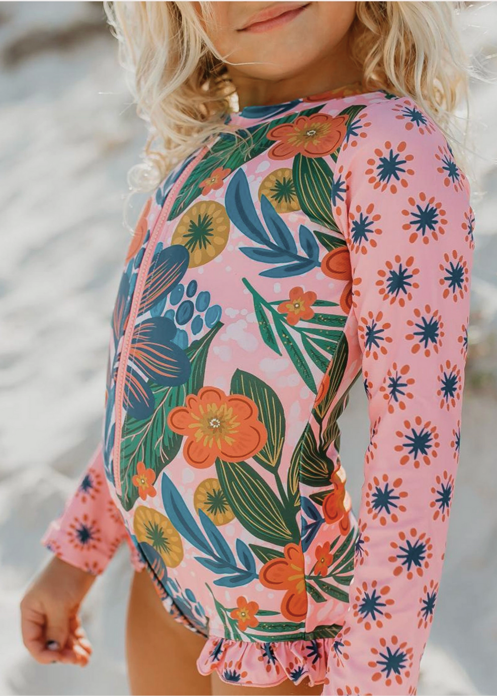 Kids Pink Tropical Zip Rash Guard One Piece Swimsuit