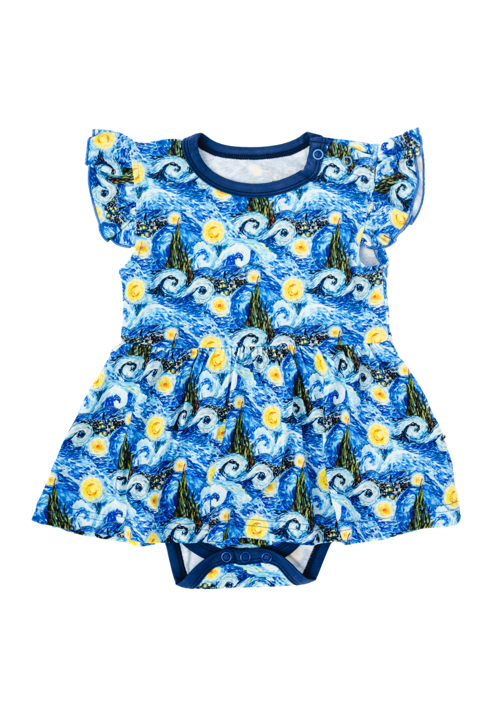 Say hello to our new watercolor Starry Night Baby Dress! Crafted from buttery soft bamboo, this darling dress has two snaps at the shoulder and three at the crotch for easy diaper changes. The flutter sleeves provide a cute, feminine touch!