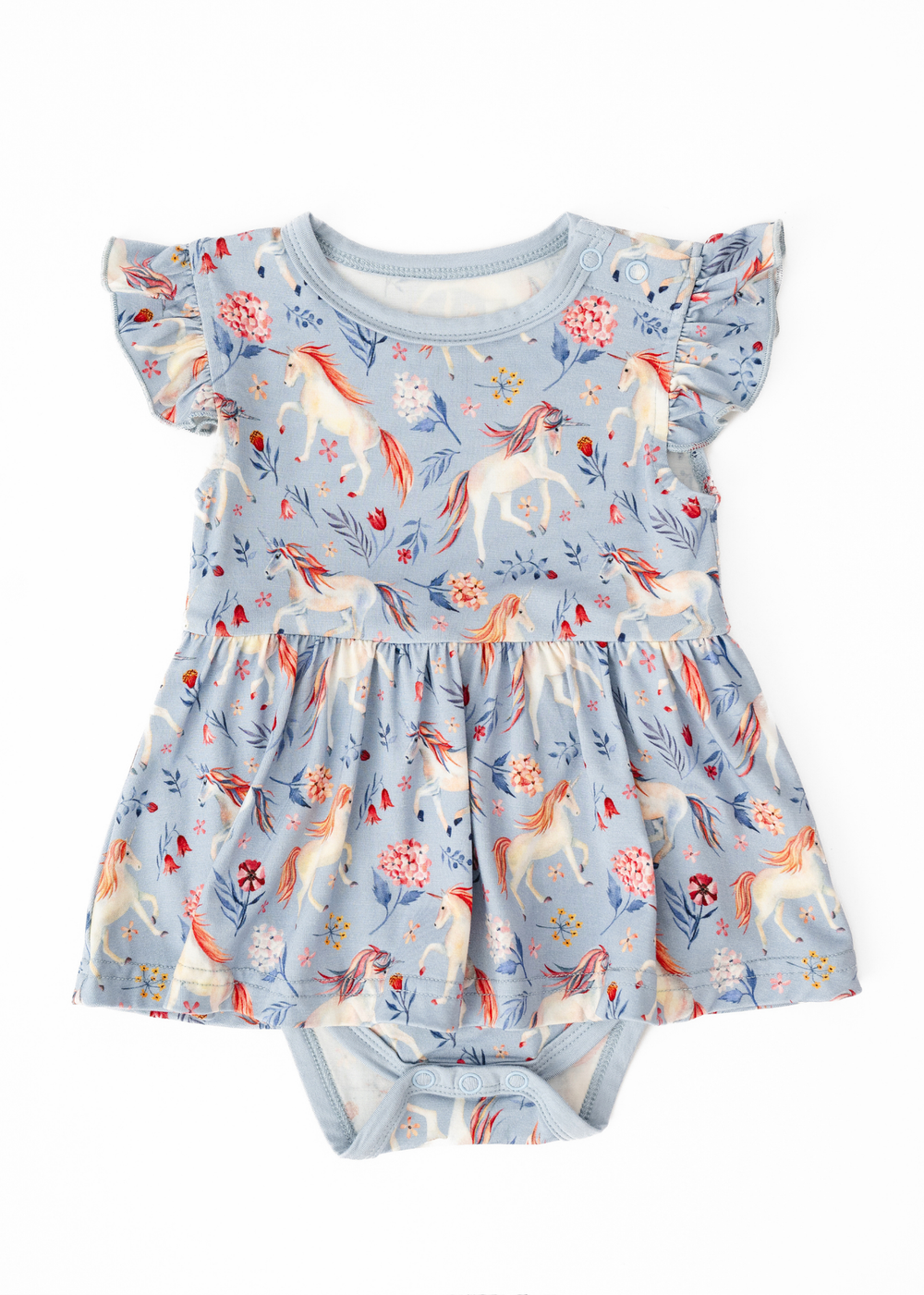 Say hello to our new watercolor floral, Unicorns Baby Dress! Crafted from buttery soft bamboo, this darling dress has two snaps at the shoulder and three at the crotch for easy diaper changes. The flutter sleeves provide a cute, feminine touch!